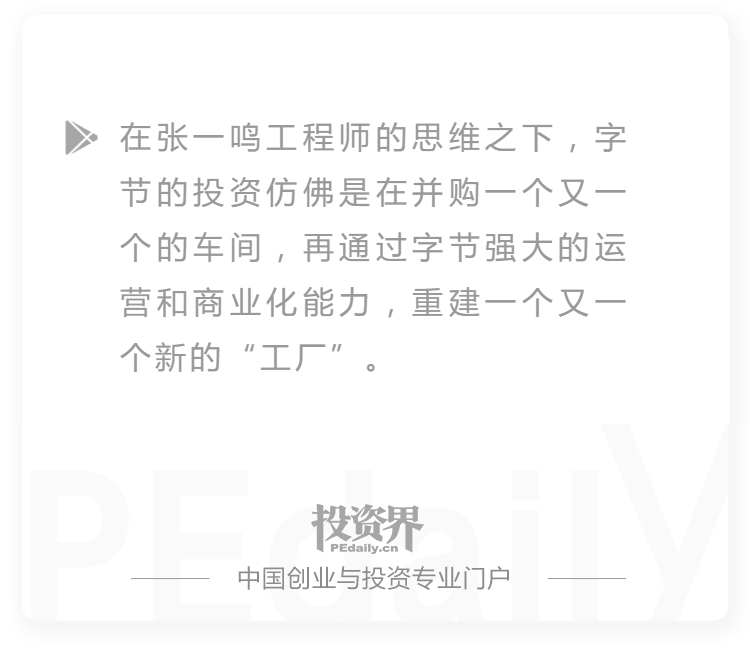 在张一鸣工程师的思维之下,字节的投资仿佛是在并购一个又一个的车间,再通过字节强大的运营和商业化能力,重建一个又一个新的“工厂”。