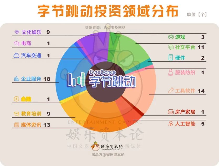 字节的投资方向,从媒体资讯、社交平台的老本行,到企业服务、金融、文娱、教育、游戏、电商等多个领域均有涉猎。