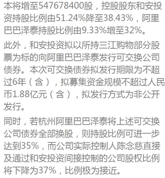 而若阿里巴巴泽泰将可交换债全部转换为股份,则持股增至35%,三江股份实际控制人陈念慈直接及通过和安投资间接控制的公司股权比例将下降为37%。