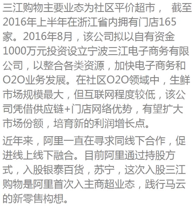 在宁波家喻户晓的三江购物(601116.SH)18日晚公告称,阿里巴巴集团子公司杭州阿里巴巴泽泰信息技术有限公司(简称“阿里巴巴泽泰”)拟通过协议受让、认购定增股票、认购可交换债等方式收购三江购物股份。收购完成后,阿里巴巴泽泰将持股32%,控股股东和安投资持股38.43%。