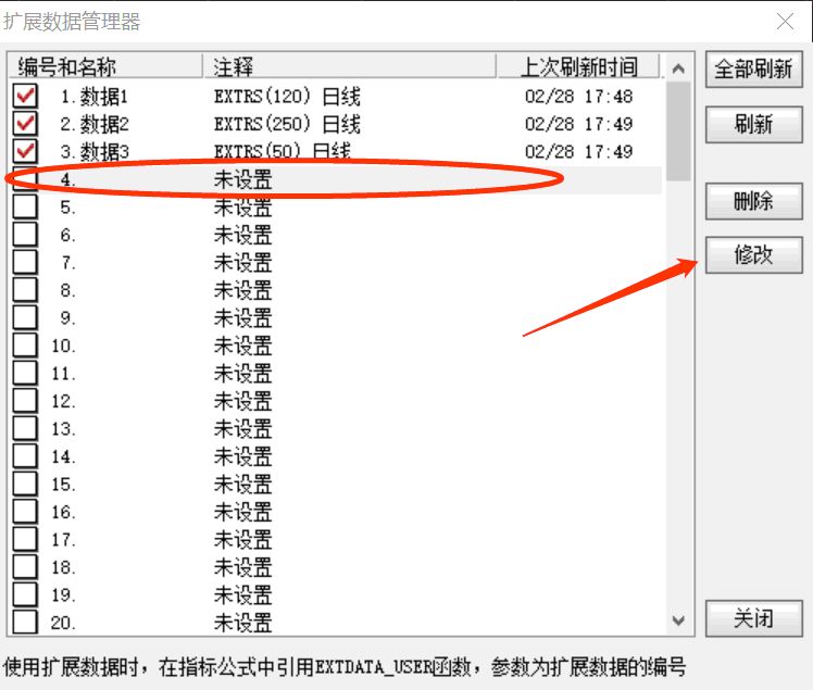 通达信软件输入:“.902”,进入扩展数据管理器。 选中第4条扩展数据,选择“修改”,如下图: