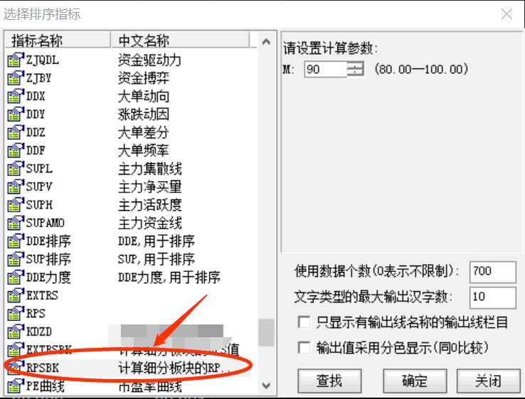然后在弹出的“选择排序指标”窗口中选择“RPSBK”,即可根据板块RPS指标进行排序了。