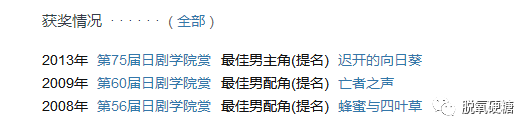 还凭借《迟开的向日葵》、《亡者之声》、《蜂蜜与四叶草》等作品获得了日剧学院赏的最佳男主角提名。