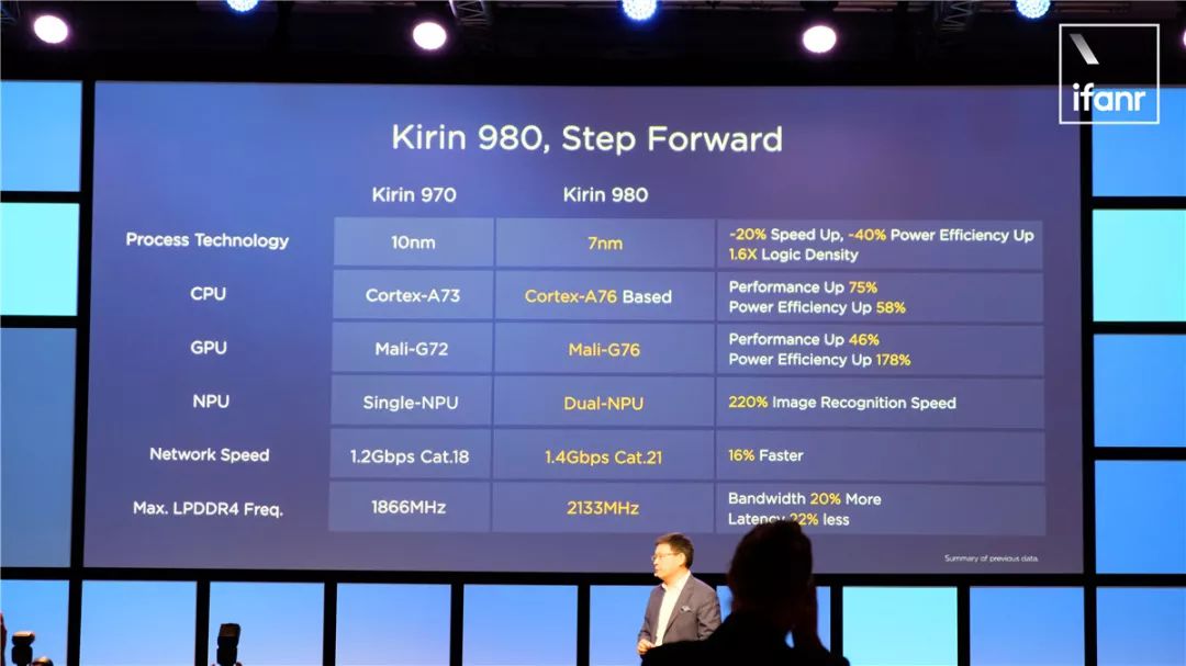 可以看到,相比于前代麒麟 970,麒麟 980 也是全方位的超越。麒麟 980 此次首发了 TSMC 7nm 制造工艺,相比业界普遍采用的 10nm 制造工艺,性能可提升 20%,能效提升 40%,晶体管密度提升到 1.6 倍,在不到 1 平方厘米面积内集成了 69 亿晶体管。