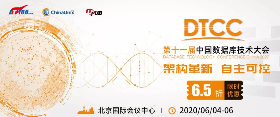 2020年6月4日~6月6日,由 IT168 旗下 ITPUB 企业社区平台主办的第十一届中国数据库技术大会(DTCC2020),将在北京隆重召开。大会以“架构革新 自主可控”为主题,设置2大主会场,20+技术专场,将邀请超百位行业专家,重点围绕数据架构、AI与大数据、传统企业数据库实践和国产开源数据库等内容展开分享和探讨,为广大数据领域从业人士提供一场年度盛会和交流平台。点击阅读原文,立享6.5折限时优惠。