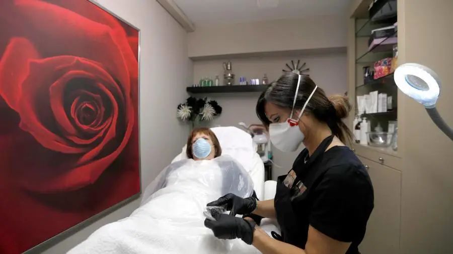 美容师Eva García戴着口罩和手套保护,在美发沙龙为顾客修指甲。