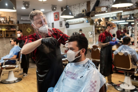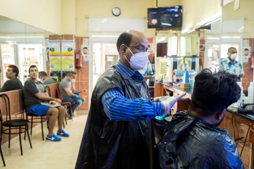 在这里没有做足所有的安全措施。座椅之间保持安全距离,但进入时不提供酒精凝胶,也无需预约。实际上,顾客可以阅读报纸来打发等待的时间。唯一的特殊之处是每个顾客在使用剃刀之前都必须戴上的黑色染料袋。现年47岁的Saif Ali有着一头浓密的头发, “我有两个月没有剪过”。