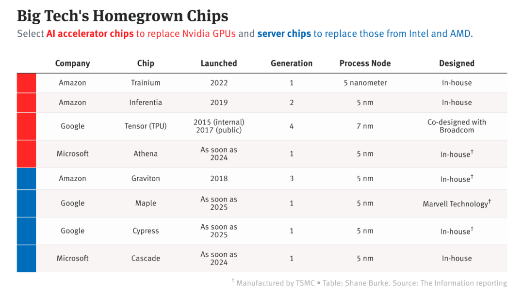 如上图所示:亚马逊、微软和谷歌均把芯片提升到了 in-house 自研的重要性程度,为数据中心部门开发两种芯片:标准计算芯片和专门用于训练和运行机器学习模型的芯片,这些模型可以为 ChatGPT 等聊天机器人提供支持。