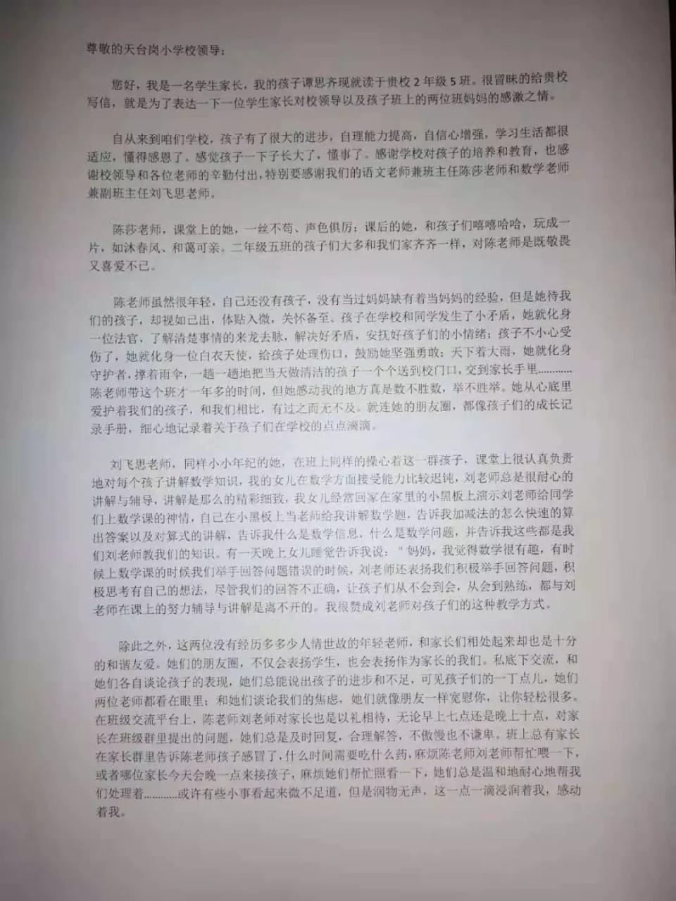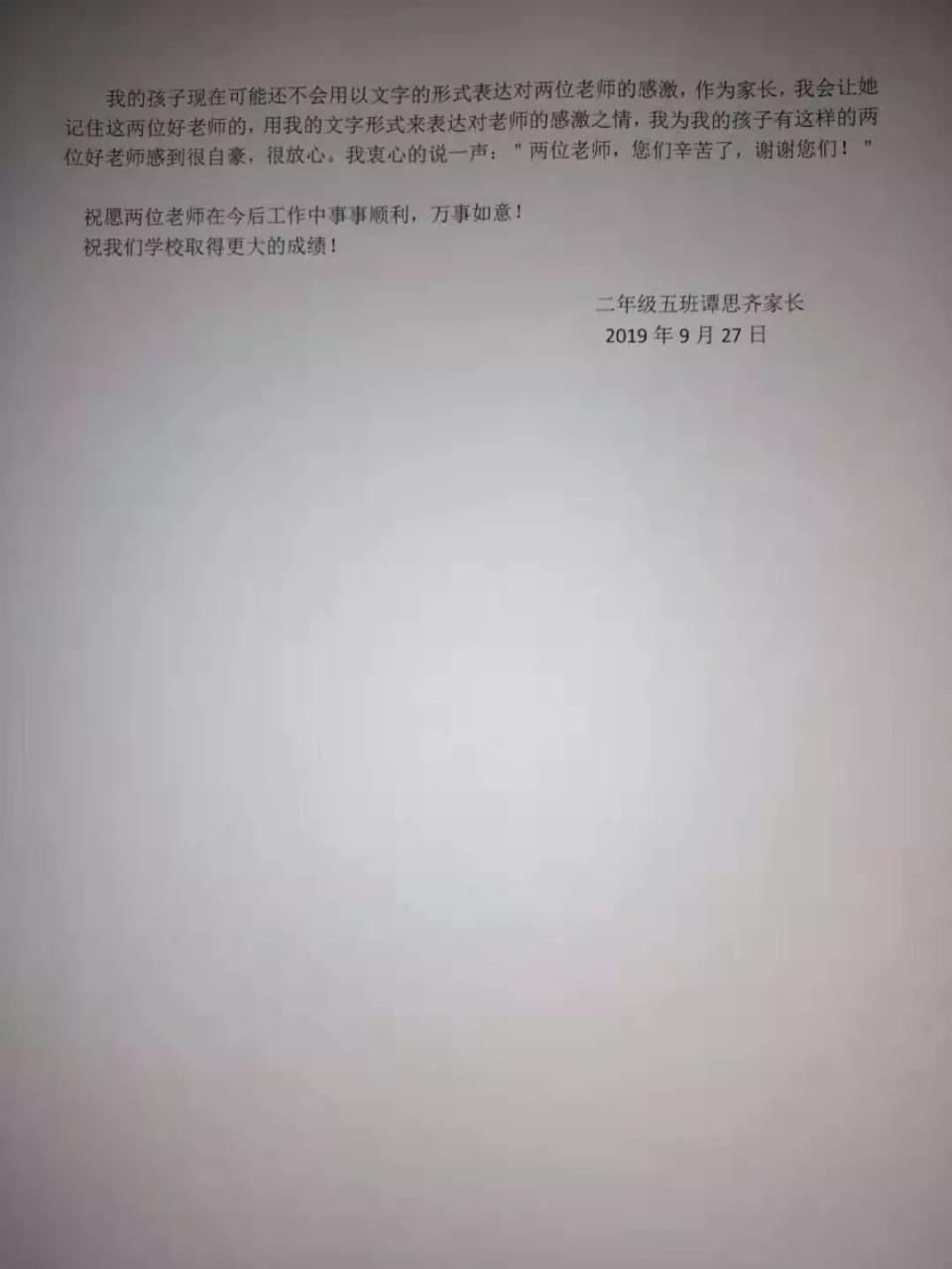这封信来自于二年级五班谭思齐家长,在信中,谭思齐家长对该班班主任陈莎老师、副班主任刘飞思老师表达了诚挚地感谢,用朴实的语言将两位老师对学生的悉心教导、用心照顾娓娓道来。“陈莎老师,课堂上的她,一丝不苟、声色俱厉;课后的她,和孩子们嘻嘻哈哈,玩成一片,如沐春风、和蔼可亲。二年级五班的孩子们大多和我们家齐齐一样,对陈老师是既敬畏又喜爱不已。陈老师虽然很年轻,自己还没有孩子,没有当过妈妈,却有着当妈妈的经验,但是她待我们的孩子,却视如己出,体贴入微,关怀备至。孩子在学校和同学发生了小矛盾,她就化身一位法官悉心教导,了解清楚事情的来龙去脉,解决好矛盾,安抚好孩子们的小情绪;孩子不小心受伤了,她就化身一位白衣天使,给孩子处理伤口,鼓励她坚强勇敢;天下着大雨,她就化身守护者,撑着雨伞,一趟一趟地把当天做清洁的孩子一个个送到校门口,交到家长手里”。