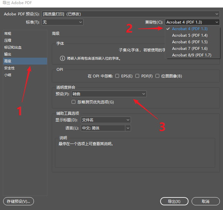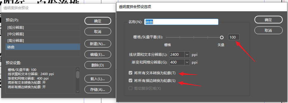 在透明度拼合的预设中选择,第二步我们设置的「透明度拼合预设」即可