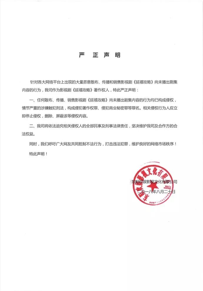 昨日晚间,《延禧攻略》官方微博发布声明,言明了维权和打击盗版的态度。