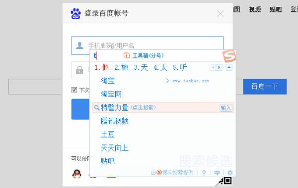 2)百度页面除了搜索框其他入口也会触发该搜索选项列表出现,如下图在登录框输入文本时也触发了搜狗搜索选项列表: