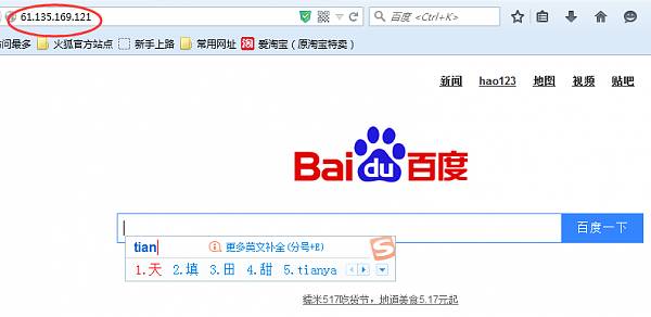 3)使用IP地址代替域名打开百度首页。测试机ping得到的IP地址为:61.135.169.121,结果搜狗输入法未出现搜索选项列表,如图所示: