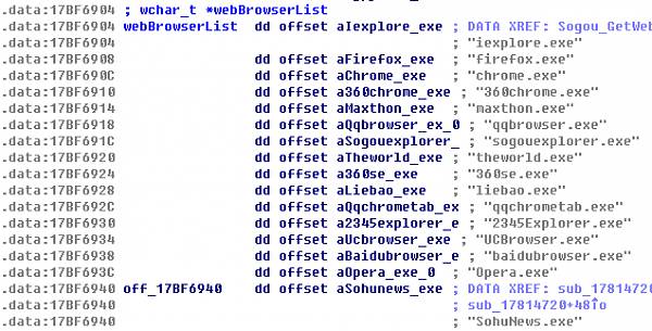将所有常见浏览器可执行文件名硬编码存入全局字符串数组,并将当前进程exe文件名在列表中遍历,获取其在列表中的索引,若未找到,则返回-1,下面是IDA反汇编结果: