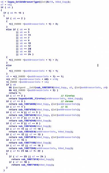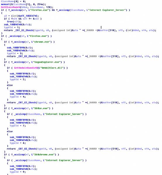 判断方法同2)中的Sogou_GetWebBrowserType(sub_178356D0()),该函数获取当前浏览器类别,内部通过进程名、当前焦点窗口窗口类名(”InternetExplorer_Server”)综合判断进行分类。下面是IDA反汇编逻辑部分截图: