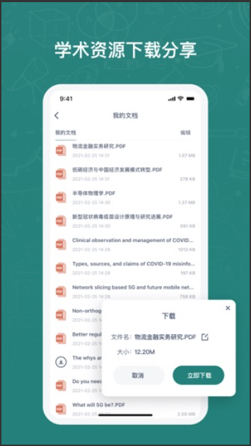 点击搜索论文,你可以直接输入中文的关键词,然后就可以搜索出国外超多平台有关你关键词的学术资源和论文。点击“我的”,你可以看自己下载的文档,和你收藏的资源。