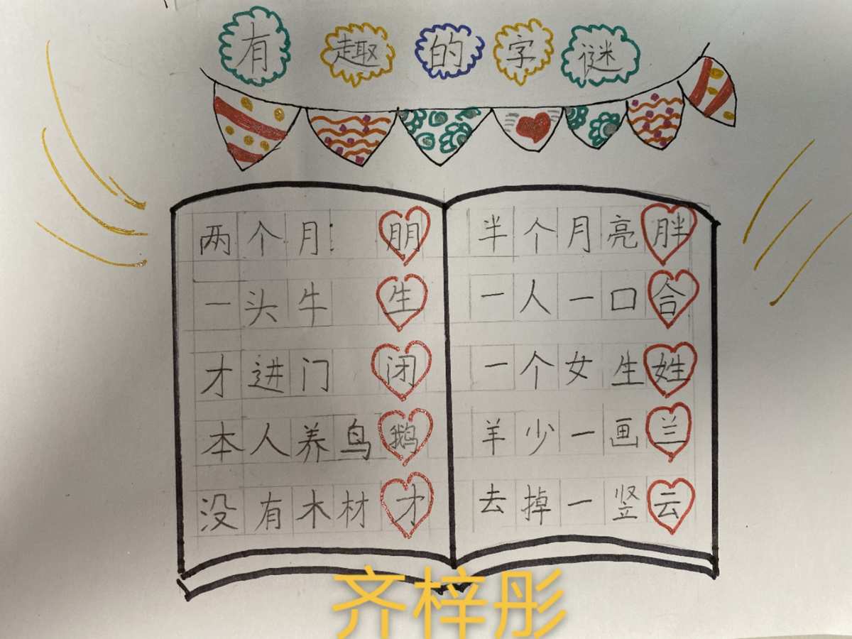 活动形式丰富多彩,趣味汉字交流会中的字谜猜猜猜、有趣的歇后语,孩子们搜集了大量的文字谜、图画谜、故事谜、歇后语,不仅学会了搜集资料的方法,感受了汉字的无限魅力,而且增强了学习语文的兴趣。