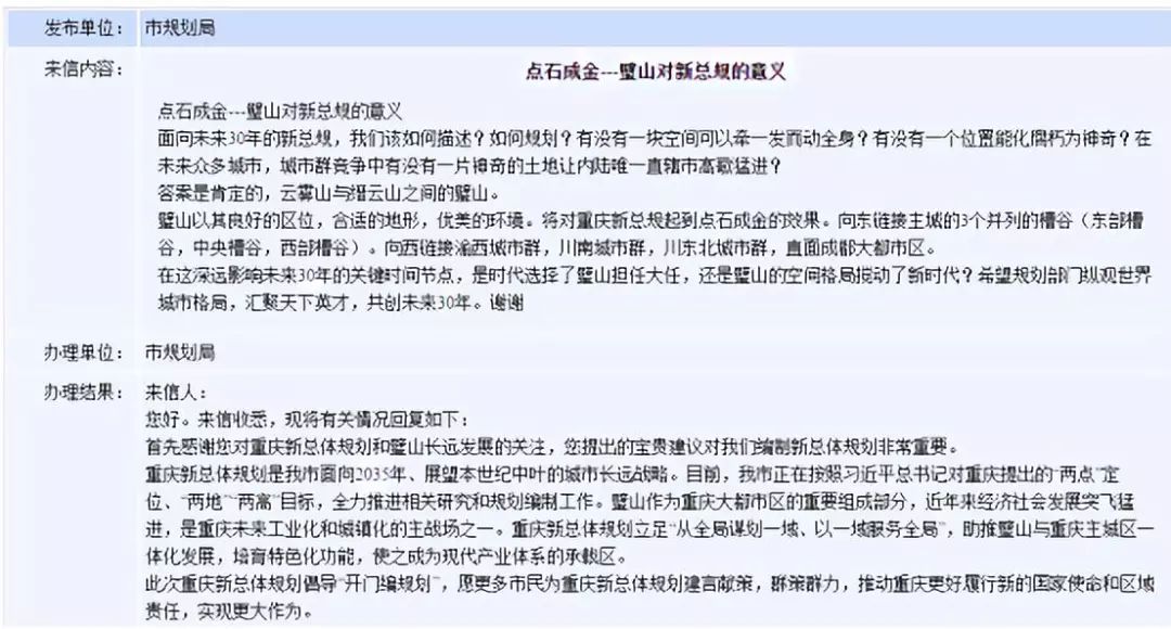 而在另一条关于新总规的信件回复中,规划局则表示:重庆新总规立足“从全局谋划一城,以一域服务全局”,助推璧山与重庆主城区一体化发展,培育特色化功能,使之成为现代产业体系的承载区。