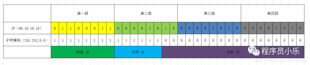 以 A 类地址 99.10.10.10 为例,前 8 位是网络 IP ,后 24 位是主机 IP 。(如下图)