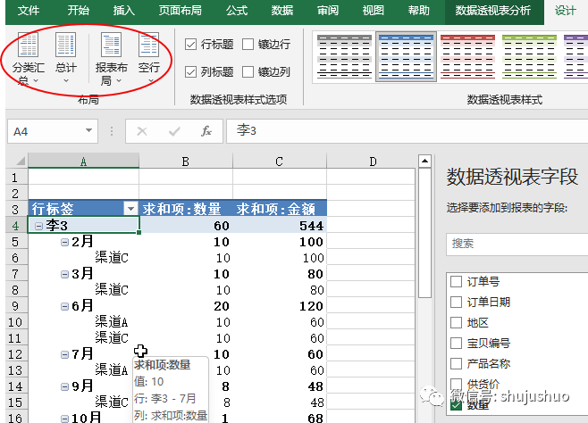 图例是Excel默认生成的数据透视表,领导说有点乱,看到最后有点晕。所以,咱们今天就给大家分享下如何进行报表格式布局的设置,在Excel 2016中,几乎所有的设置都可以在专属“设计”菜单中找到,包括分类汇总、总计、报表布局、空行。咱么今天就按重要性来讲解,而不是一般的按顺序论资排辈。