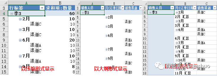 这里我们采用默认的“以压缩形式显示”报表布局为例,展示3个选项的对比效果。需要注意的是,如果采用了“以表格形式显示”报表选项,那么就不能使用“在组的顶部显示所有分类汇总”命令了,毕竟这个时候所有行标签都在以一行不是。