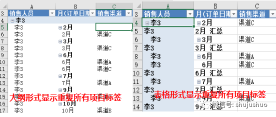 这两个选项只有在大纲或表格形式下才有用,压缩形式是没有效果的,因为压缩形式所有的行标签就在一列数据中。默认不重复的效果上一个图例已经有了,为了给大家节省流量,咱们只展示一下“重复所有项目标签”的效果。