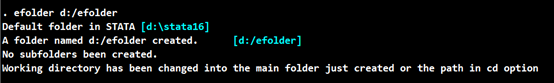 我们看到,在D盘下,新创建了一个文件夹“efolder”,且Stata的当前工作路径也从“d:/stata16”切换为“d:/efolder”。原本需要执行“mkdir d:/efolder”和“cd d:/efolder”两步,现在一步即可完成,并且不用担心这个文件夹是否事先存在。