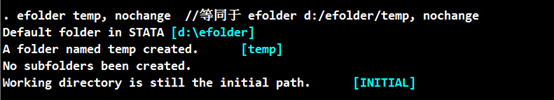 在上一步操作中,我们已经将“d:/efolder”设置为当前工作路径。此时,若我们需在该路径下创建一个名为“temp”的文件夹,但保持当前工作路径不变,则可加入nochange选项。需要注意的是,如果efolder后面的foldername没有带计算机盘或指定路径名,则默认是在当前工作路径下创建。执行如下程序: