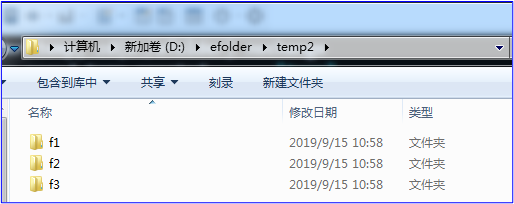 利用sub选项,可以在当前工作路径或指定路径下新建文件夹,并在新文件夹下生成3个默认名称为“f1”、“f2”、“f3”的子文件夹。比如,如果我们需在当前工作路径“d:/efolder”下创建新文件夹“temp2”,并进一步生成3个子文件夹,可通过以下程序完成,结果如下图所示: