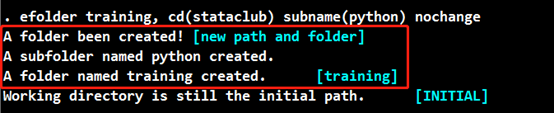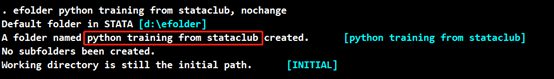 此外,相比于mkdir和cd命令的组合切换到d盘的命令,efolder命令的一个最亮眼功能在于,它允许文件夹名称中包含空格(创建时不需加引号)。比如,我们要在当前路径“d:/efolder”下创建一个名称为“python training from stataclub”的文件夹,则直接执行:
