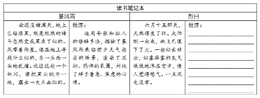 (2)本题考查对名著内容批注。“天热得发了狂”运用拟人的修辞,将炎热的天人格化。“太阳刚一出来,地上已经像下了火”运用夸张的修辞,极写天气的炎热,这样极度炎热的天气里,祥子却仍然出去拉车,表现了他的吃苦耐劳、顽强坚韧。