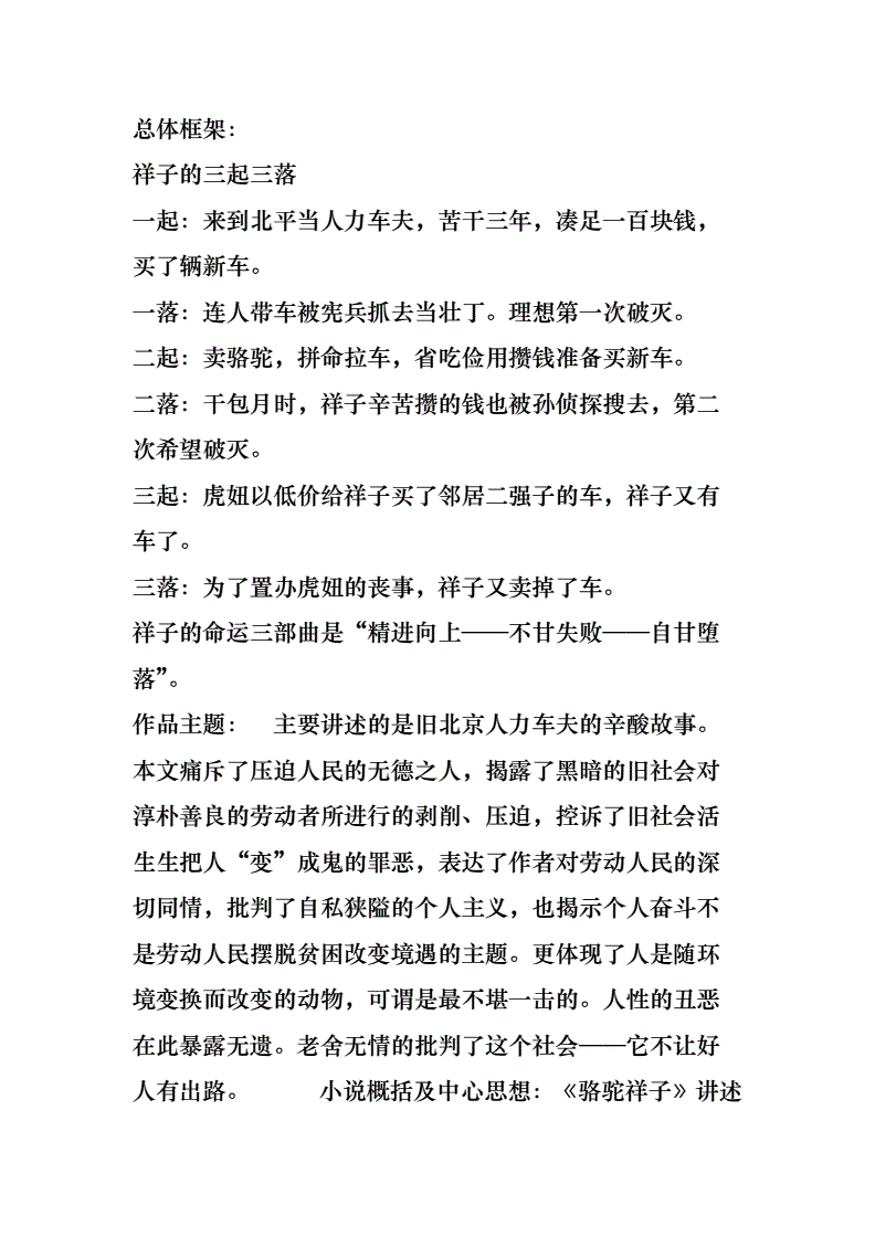 【解析】(1)本题考查名著内容识记。《骆驼祥子》讲述的是中国北平城里的一个年轻好强、充满生命活力的人力车夫祥子三起三落的人生经历。祥子的“三起三落”指的是:一起,来到北平当人力车夫,苦干三年,凑足一百块钱,买了辆新车。一落,有一次连人带车被宪兵抓去当壮丁。理想第一次破灭。二起,卖骆驼,拼命拉车,省吃俭用攒钱准备买新车。二落,干包月时,祥子辛苦攒的钱也被孙侦探骗去,第二次希望破灭。三起,虎妞以低价给祥子买了邻居二强子的车,祥子又有车了。三落,为了置办虎妞的丧事,祥子又卖掉了车。这一连串的打击,对于把车当成生命的祥子来说骆驼祥子全文,无疑是非常沉重的。据此作答。