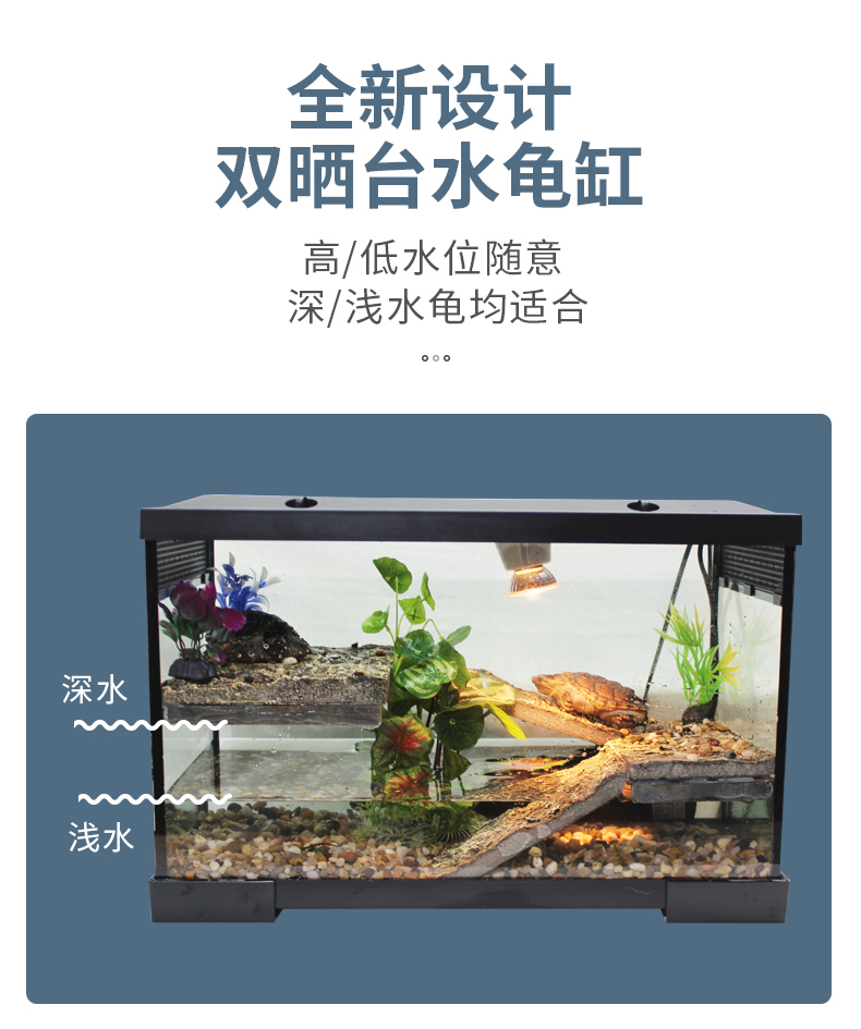 2、 龟缸:越还原自然状态越好。买大缸不用总换,巴西龟们也觉得行动自由。缸壁高一点,防止它爬出来。有水有陆。水深为巴西龟壳厚度的3倍最佳。水底可扑沙子和雨花石巴西龟吃什么食物?一般几天喂食一次,种几株水草。再养几尾小鱼。再弄一个陆地。若买的巴西龟缸会有楼梯和陆地。若普通鱼缸就摆一块大石头。放在阳光可照到的地方。这是一个最简单的置法。若有条件可以买紫外灯放在距龟箱30厘米高处给它每天照15—20分钟。天冷温度低时买加热棒,温度25度为宜。