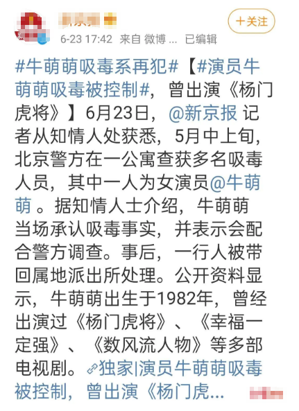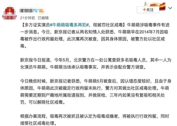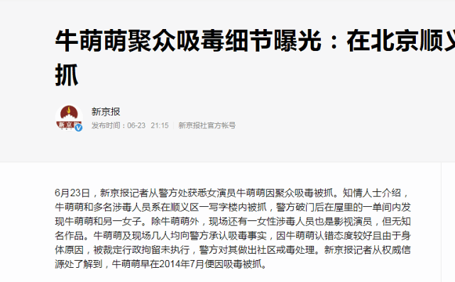 随即,又一篇报道发出,称演员牛萌萌已经不是首次吸毒,被逮捕时已是二次就犯。