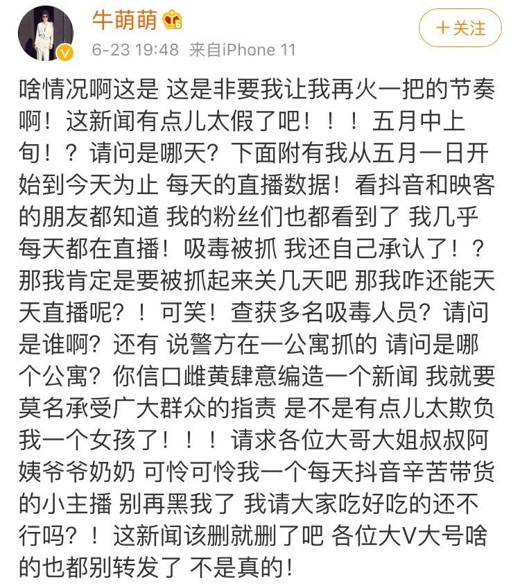 牛某某在微博上喊冤道:“啥情况啊这是 这是非要我让我再火一把的节奏啊!这新闻有点儿太假了吧!!!五月中上旬!?请问是哪天?下面附有我从五月一日开始到今天为止 每天的直播数据!看抖音和映客的朋友都知道 我的粉丝们也都看到了 我几乎每天都在直播!吸毒被抓 我还自己承认了!?那我肯定是要被抓起来关几天吧 那我咋还能天天直播呢?!可笑!”