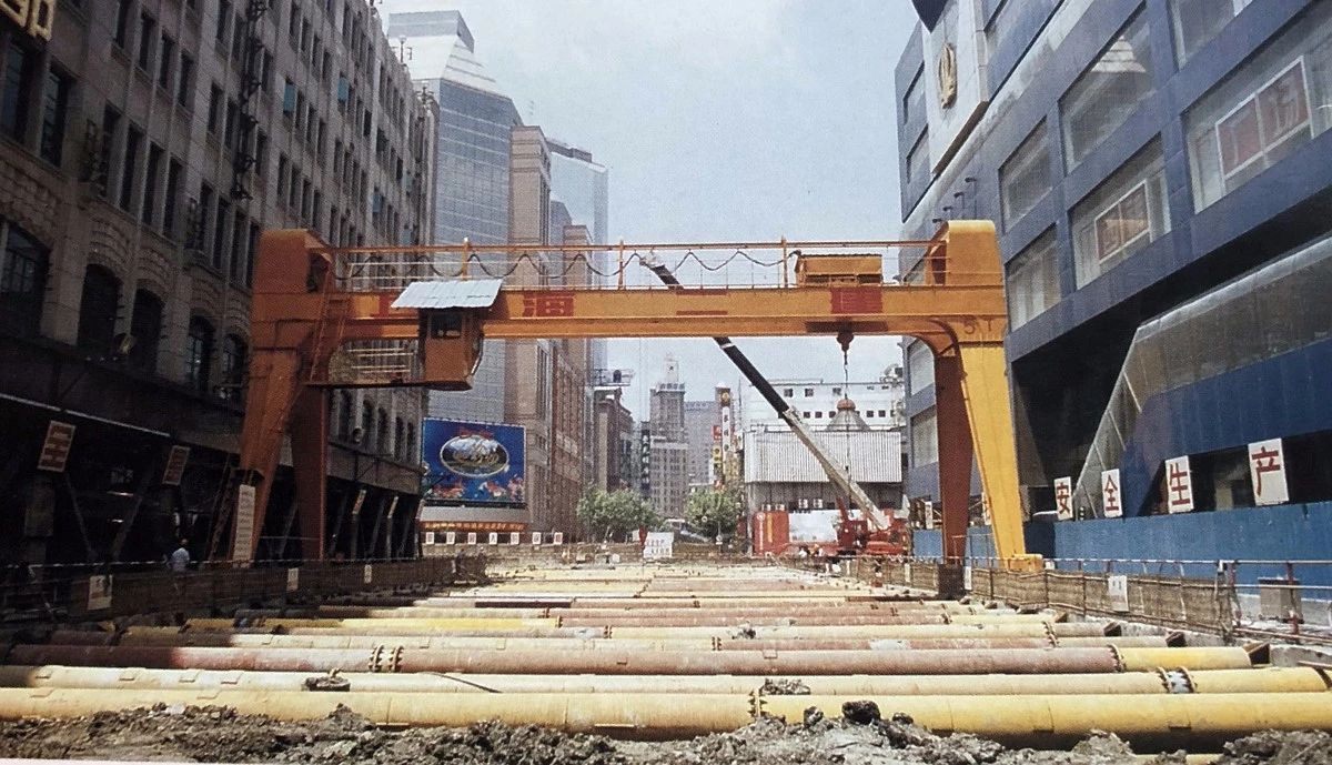 1993年春节前后的淮海中路茂名路口。地铁1号线陕西南路站点施工初战告捷。