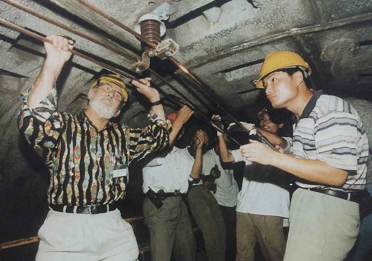 中外技术人员正在为即将开通的地铁2号线安装接触网线。