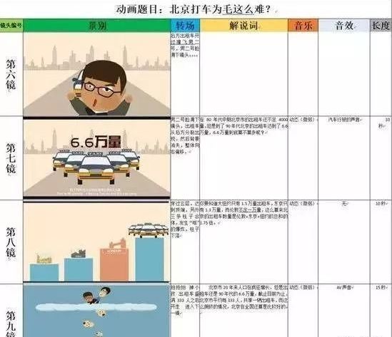 一个完整的分镜头要包括7大要素,这七大要素分别是镜头编号、景别、对话(解说词、旁白)、音乐、音效和镜头长度。当然根据自己的喜欢也可以适当的进行删选,关键看自己的习惯。如上图(其实这个课件并没有严格的按照的分镜制作流程走,其中省去了很多关键的要素,但是却已经达到了制作分镜头的目的)。
