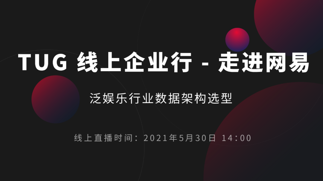 5 月 30 日,TUG 企业行将走进网易,为大家分享网易、虎牙等企业在「泛娱乐行业数据架构选型」方面的经验。受疫情影响网易社区,本次活动将采用线上直播的方式进行,扫描文中的二维码报名,届时将为您推送直播链接!