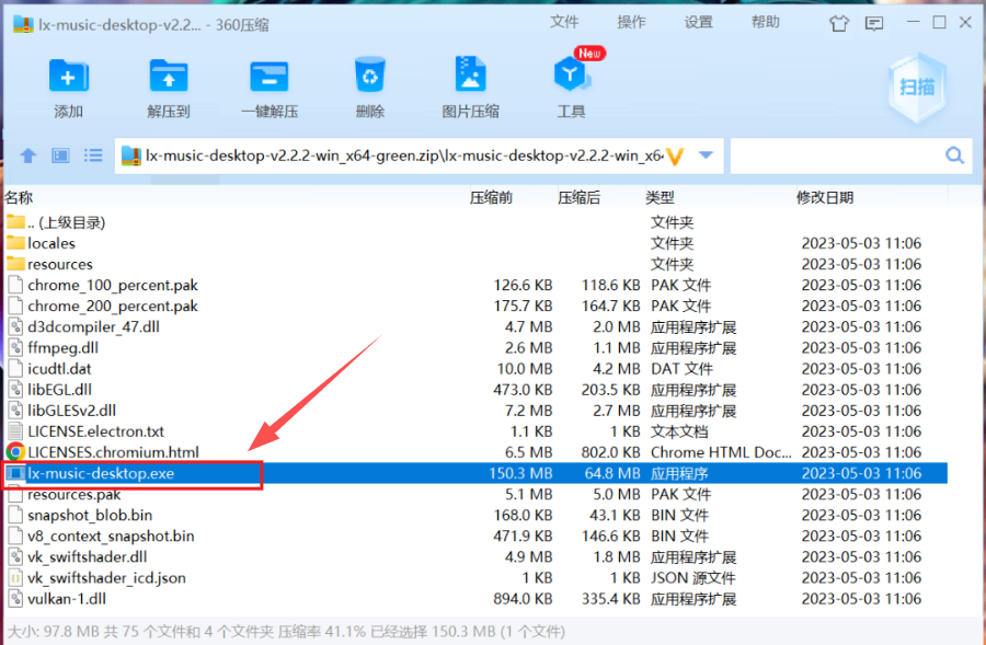 首先我们下载软件后(获取方式在文章结尾)全网免费音乐下载,双击打开压缩包,找到里面的lx-music-desktop.exe文件,双击打开。