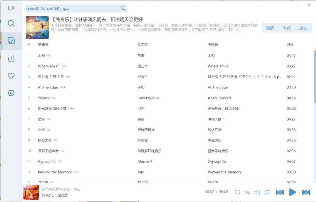 洛雪音乐助手电脑版,这是一款运行Windows桌面的音乐播放软件,其中的音频文件免费又无损,软件清爽简洁,绿色无弹窗、无广告,而且还无需安装,下载后就可以直接双击使用,能够为您带来舒适的听觉体验。