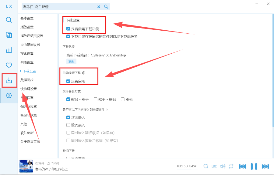 注意:想要下载歌曲一定要记得在下载设置中打开“启用下载功能”,否则左边是没有下载区域的,而且记得将“自动换源下载”打开,这样如果下载失败会自动切换下载源,真正实现多源下载!