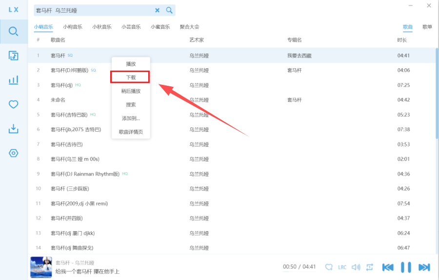 下载歌曲只需要在想要下载的歌曲右键单击,点击“下载”即可,这样就可以下载区域内看到下载的歌曲列表了。