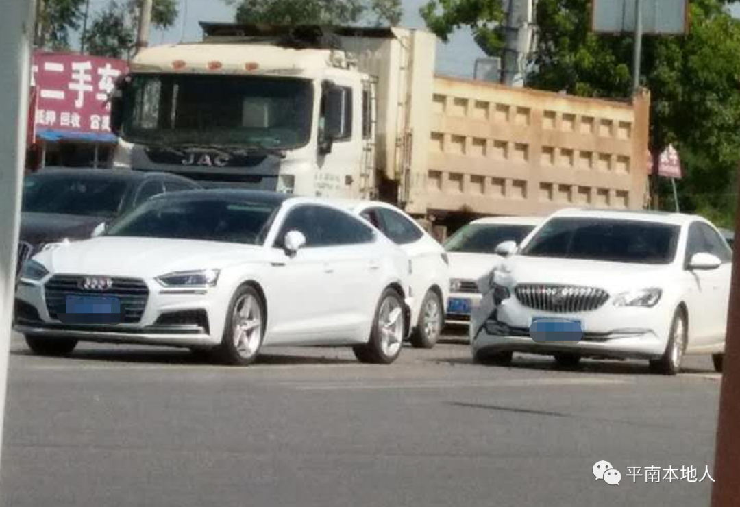 奥迪屁股变形、凹进一大块;别克车受损更为严重,前挡护胶破损,右侧大灯,撞得稀烂,地上依稀看到散落各样碰撞碎片。可见,相撞力度,也不小啊。