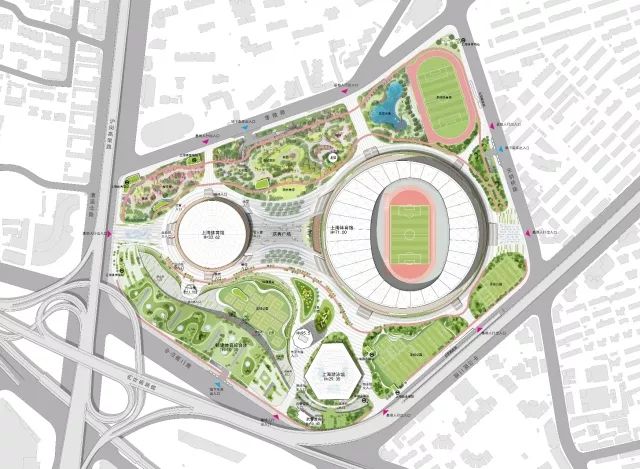 上海体育场,又称“上海八万人体育场”,与上海体育馆及上海游泳馆共同组成上海重要的城市标志,是众多上海市民心中的体育圣地。曾经是第八届全运会的主会场,也是2008奥运会足球比赛场地,中超豪门上海上港俱乐部的主场。由于过去二十年的城市发展,片区内形成越来越多的灰空间。过多的车行入口,地面停车场和过少的可利用开放空间,使得该区域不具备持续发展的条件,设计师首先遇到的挑战便是将此区域进行重新规划。