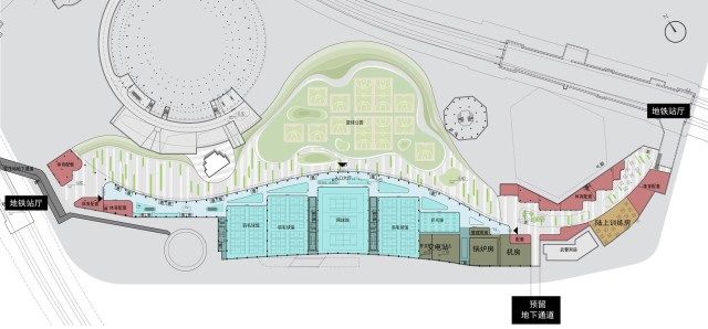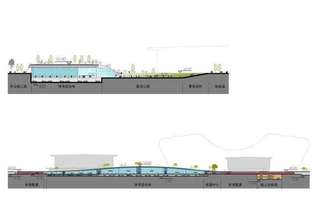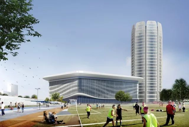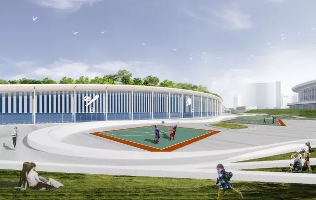 在南面体育公园内新建运动综合体,以绿色的“屋顶”遮盖,使建筑与周围自然环境充分融为一体。这座下沉式的综合体将提供满足市民日常运动和锻炼的场所, 40片羽毛球场、30片乒乓球场、3片网球场,以及壁球、击剑、体操、健身房等设施。