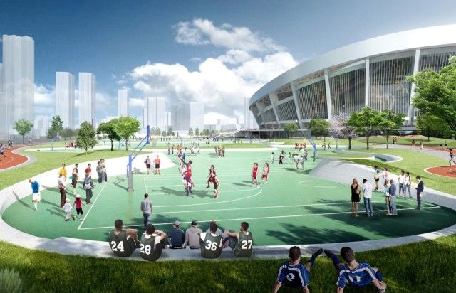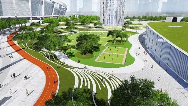 北面为“有氧公园”,为市民休闲休憩需求提供了移步异景的优美环境。南面将打造一片“运动公园”,其中足球公园5人制足球场,7人制足球场共7片;篮球公园为4片标准篮球场,8片3对3篮球场。