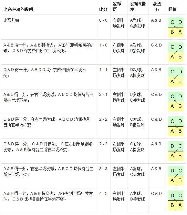 1、与单打一样,发球方得分为偶数时,发球方在右半场进行发球。当发球方得分为奇数时,在左半场进行发球 ;