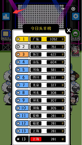其次是羊了个羊在好友排行榜、全国排行榜等只和个人相关的排行榜之外,还搞起了地区排行榜。比如哪个省份的玩家通关最多,得分最高等等。