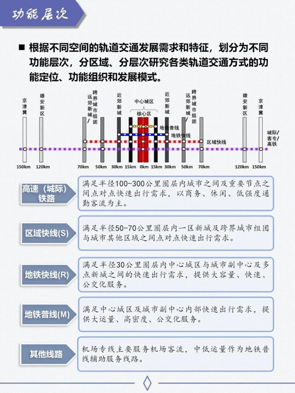 1. 地铁快线(R线):中心城区与副中心、多点新城与中心城区之间快速联系的主导轨道交通方式,线路以服务通勤客流为主,提供大站快车式服务。